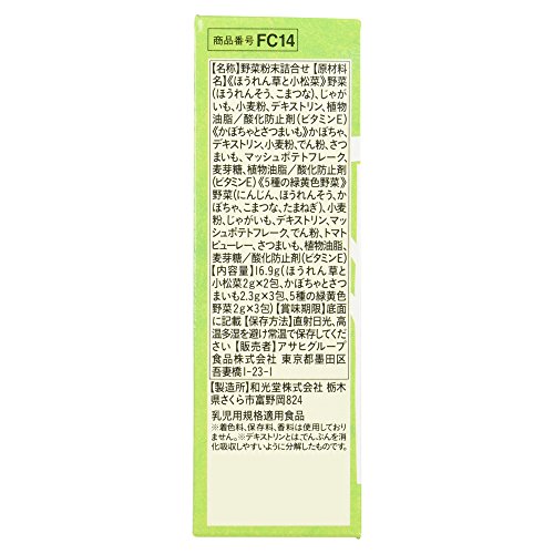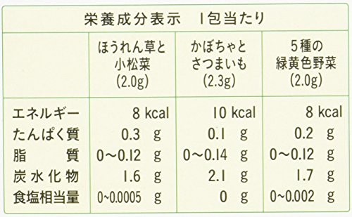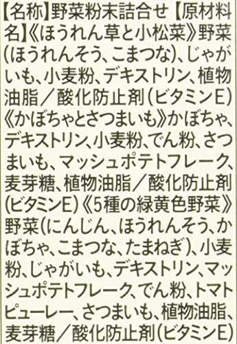 - 原材料:【ほうれん草と小松菜】野菜(ほうれんそう、こまつな)、じゃがいも、小麦粉、デキストリン、植物油脂/酸化防止剤(ビタミンE) 【かぼちゃとさつまいも】かぼちゃ、デキストリン、小麦粉、でん粉、さつまいも、マッシュポテトフレーク、麦芽糖、植物油脂/酸化防止剤(ビタミンE) 【5種の緑黄色野菜】野菜(にんじん、ほうれんそう、かぼちゃ、こまつな、たまねぎ)、小麦粉、じゃがいも、デキストリン、マッシュポテトフレーク、でん粉、トマトピューレー、さつまいも、植物油脂、麦芽糖/酸化防止剤(ビタミンE)