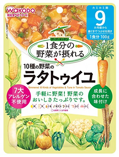 ●【商品説明】●「1食分の野菜が摂れる グーグーキッチン 10種の野菜のラタトゥイユ 100g 9か月頃から」は、10種類の野菜とツナをまろやかトマトソースでじっくり煮込んだ、ラタトゥイユ風ベビーフードです。●7大アレルゲン(卵・乳・小麦・落花生・そば・えび・かに)不使用で作りました。●着色料、保存料、香料不使用。●乳児用規格適用食品。●9か月頃から。●【お召し上がり方】●調理済みですので、そのまま召し上がれます。●温めますといっそうおいしく召し上がれます。●お湯で温める場合:袋の封を切らずにお湯の中に1-2分つけて温めてください。●袋の穴に、はしなどを差し込んで取り出します。●切り口から封をあけ、器などに移し、軽くかき混ぜてからお召し上がりください。●※火にかけて沸騰させたまま温めないでください。●電子レンジで温める場合:中身を電子レンジ対応の容器に移し、ラップをかけて温めてください。●加熱時間の目安は30秒(500W)程度です。●※ラップをとる際に、熱くなった中身がはねることがありますのでご注意ください。●【ご注意】●熱湯の取扱いにご注意ください。...
