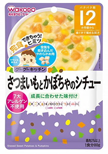 ●【商品説明】●「和光堂 グーグーキッチン さつまいもとかぼちゃのシチュー 12か月頃から 80g」は、月齢にあわせた具材の固さと大きさ、食べやすい食感にこだわったベビーフード(12ヶ月頃から)です。●着色料、保存料、香料は使用しておりません。●さつまいもとかぼちゃのやさしい甘味のほくほくシチューです。●乳成分は使用しておりません。●賞味期限等の表記について西暦年/月/日の順番でパッケージに記載。●【お問い合わせ先】●アサヒグループ食品株式会社東京都墨田区吾妻橋1-23-1お問い合せ先お客様相談室東京都渋谷区恵比寿南2-4-1フリーダイヤル:0120-889283●【原産国】●日本●【原材料名・栄養成分等】●名称:シチュー●原材料名:野菜(にんじん、スイートコーン、さやいんげん、かぼちゃ)、さつまいも、豆乳、野菜ピューレー(かぼちゃ、たまねぎ)、鶏肉加工品(鶏肉、たまねぎ、大豆たん白、でん粉)、チキンエキス、砂糖、食塩、米酢/増粘剤(加工でん粉)●栄養成分表示:1袋(80g)当たりエネルギー:44kcal、たんぱく質:1.7g、脂質:0.5g、炭水化物:8.2...