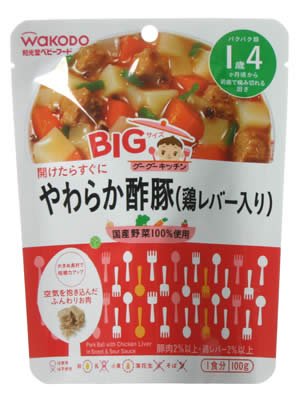 「BIGサイズのグーグーキッチン やわらか酢豚(鶏レバー入り) 100g」は、咀嚼力アップを考えた大きめ具材のベビーフードです。臭みを抑えた鶏レバー入りふんわり鶏肉だんごと野菜を、ケチャップベースの甘酸っぱいソースにからめました。食べやすく、噛みやすい具材を選び、国産野菜を使用しています。パクパク期の1歳4か月頃から。ボリュームたっぷりのビックサイズ。着色料、保存料、香料は使用していません。 内容量 : 100g(1食分)