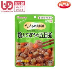 ●【商品説明】●「和光堂 食事は楽し 鶏とごぼうの五目煮 100g (区分2/歯ぐきでつぶせる)」は、やわらか製法で仕上げた鶏肉をごま油と和風だしで風味豊かに煮込んだおかず(介護食)です。●大きめ具材で見た目もおいしい五目煮です。●区分2:歯ぐきでつぶせる。●栄養サポート:ビタミンD。●【お召し上がり方】●※温めますと、よりおいしく召し上がれます。●お湯で温める場合袋の封を切らずにお湯の中に2-3分つけて温めてください。●あけくちから封をあけ、器などに移し、軽くかき混ぜてからお召し上がりください。●※火にかけて沸騰させたまま温めないでください。●電子レンジで温める場合中身を電子レンジ対応の容器に移し、ラップをかけて温めてください。●加熱時間の目安は40秒(500W)程度です。●※ラップをとる際に、熱くなった中身がはねることがありますので、ご注意ください。●【ご注意】●調理時や喫食時のやけどにご注意ください。●お湯の取り扱いにご注意ください。●食事介助の必要な方は、飲み込むまで様子を見守って下さい。●かむ力、飲み込む力には個人差がありますので、必要に応じ...