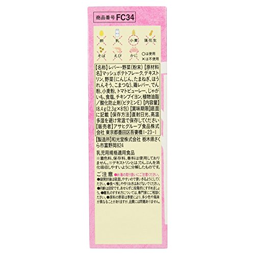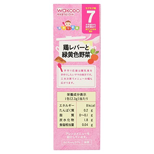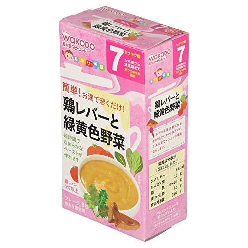 ●【商品説明】●「手作り応援 鶏レバーと緑黄色野菜 8包 7ヶ月頃から」は、国産の緑黄色野菜と鶏レバーを使用して食べやすくしたペースト(ベビーフード)です。●お湯で溶くだけでなめらかなペーストが作れます。●おかゆに混ぜたり、野菜を加えたりと、いろいろなメニュー作りにお使いください。●鶏レバー5%以上。●便利な個包装タイプ。●7ヶ月頃から幼児期まで。●舌でつぶせる固さ。●【原材料に含まれるアレルギー物質】●小麦●【つくり方】●本品1包に対し、お湯約10ml(小さじ2杯)を加えて溶かします。●食べやすい温度か確認してからあげてください。●(小さじは5mlの計量スプーンです)●【ご注意】●※着色料、保存料、香料は使用しておりません。●※デキストリンとは、でんぷんを消化吸収しやすいように分解したものです。●お湯の取り扱いにご注意ください。●袋開封後は吸湿しやすいので使いきるようにしてください。●食べ残しや作りおきはあげないでください。●月齢は目安です。●あせらずに段階的にすすめましょう。●離乳のすすめ方については、専門家にご相談ください。●原料の野...