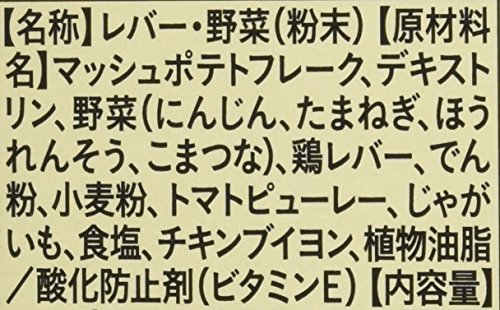 - 原材料:マッシュポテトフレーク、デキストリン、野菜(にんじん、たまねぎ、ほうれんそう、こまつな)、鶏レバー、でん粉、小麦粉、トマトピューレー、じゃがいも、食塩、チキンブイヨン、植物油脂/酸化防止剤(ビタミンE)