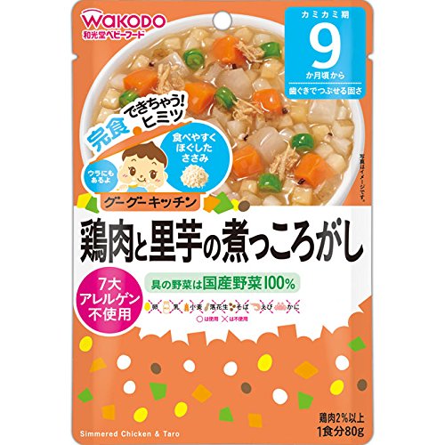 ●【商品説明】●「和光堂 グーグーキッチン 鶏肉と里芋の煮っころがし 9か月頃から 80g」は、月齢にあわせた具材の固さと大きさ、食べやすい食感にこだわったベビーフード(9ヶ月頃から)です。●着色料、保存料、香料は使用しておりません。●鶏肉と里芋をかつお昆布だしでじっくり煮込みました。●小麦を使用していないしょうゆを使っています。●賞味期限等の表記について西暦年/月/日の順番でパッケージに記載。●【お問い合わせ先】●アサヒグループ食品株式会社東京都墨田区吾妻橋1-23-1お問い合せ先お客様相談室東京都渋谷区恵比寿南2-4-1フリーダイヤル:0120-889283●【原産国】●日本●【原材料名・栄養成分等】●名称:野菜・肉煮物●原材料名:野菜(にんじん、だいこん、ごぼう、さやいんげん)、さといも、かつお昆布だし、ぶどう糖、鶏肉、しょうゆ(大豆を含む)、じゃがいも、ごま油、しいたけ水煮、チキンエキス、米酢、食塩/増粘剤(加工でん粉)●栄養成分表示:1袋(80g)当たりエネルギー:36kcal、たんぱく質:1.0g、脂質:0.9g、炭水化物:6.0g、食塩相当量:0...