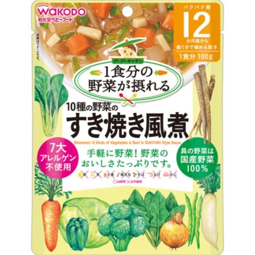 ●【商品説明】●「和光堂 1食分の野菜が摂れる グーグーキッチン 10種の野菜のすき焼き風煮 12か月頃から 100g」は、調理が面倒な野菜も含め、10種類の野菜が入ったベビーフード 野菜(12ヶ月頃から)です。●気軽に1食に必要な野菜をきちんと摂ることができます。●10種の野菜と牛肉を、甘辛く煮込みました。●野菜が溶け込んだ美味しいすき焼き風煮です。●小麦を使用していないしょうゆを使っています。●具の野菜は国産野菜100%。●着色料、保存料、香料は使用しておりません。●※パッケージリニューアルの為、掲載と異なるパッケージの商品が届く場合がございます。●ご了承下さい。●賞味期限等の表記について西暦年/月/日の順番でパッケージに記載。●【お問い合わせ先】●販売者アサヒグループ食品株式会社東京都墨田区吾妻橋1-23-1お問い合せ先お客様相談室東京都渋谷区恵比寿南2-4-1フリーダイヤル:0120-88-9283●【原産国】●日本●【原材料名・栄養成分等】●名称:野菜・肉煮物●原材料名:野菜(にんじん、だいこん、ごぼう、キャベツ、こまつな、さやいんげん、ピー...