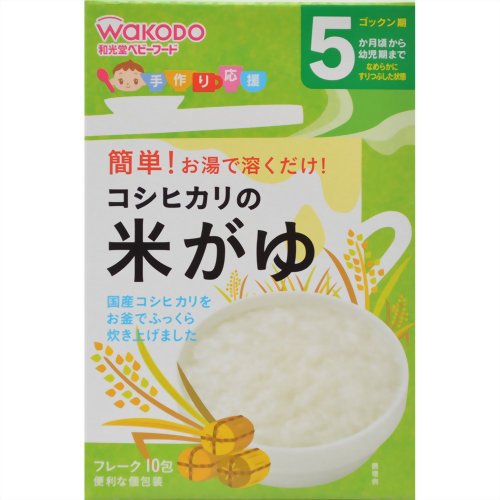 ●【商品説明】●「手作り応援 コシヒカリの米がゆ 10包 5ヶ月頃から」は、国産コシヒカリをお釜でふっくら炊き上げたおかゆ(ベビーフード)です。●お湯を加えるだけで、ふっくらおかゆができあがります。●便利な個包装タイプ。●5ヶ月頃から幼児期まで。●なめらかにすりつぶした状態。●【ご注意】●※着色料、保存料、香料は使用しておりません。●お湯の取り扱いにご注意ください。●袋開封後は吸湿しやすいので袋の口を輪ゴムなどでしめて、なるべく早めにお使いください。●食べ残しや作りおきはあげないでください。●月齢は目安です。●あせらずに段階的にすすめましょう。●離乳のすすめ方については、専門家にご相談ください。●まれに黒褐色の小片が見られることがありますが、原料の一部ですのでご心配ありません。●【保存方法】●直射日光、高温多湿を避け常温で保存してください。●【お問い合わせ先】●和光堂株式会社 お客様相談室東京都千代田区神田司町2-14-3フリーダイヤル:0120-88-9283●製造者和光堂株式会社東京都千代田区鍛冶町2-7-15●内容量:50g(5g×10包)...