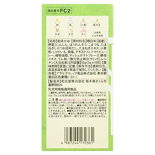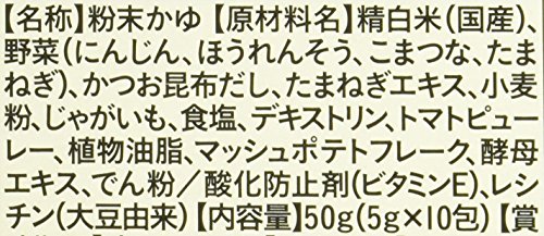 - 原材料:精白米(国産)、野菜(にんじん、ほうれんそう、こまつな、たまねぎ)、かつお昆布だし、たまねぎエキス、小麦粉、じゃがいも、食塩、デキストリン、トマトピューレー、植物油脂、マッシュポテトフレーク、酵母エキス、でん粉/酸化防止剤(ビタミンE)、レシチン(大豆由来)