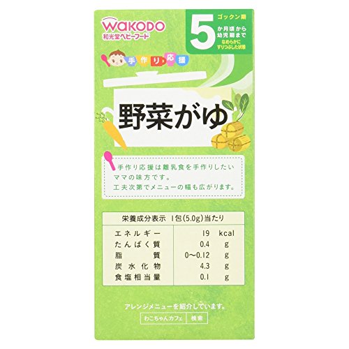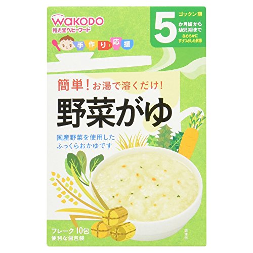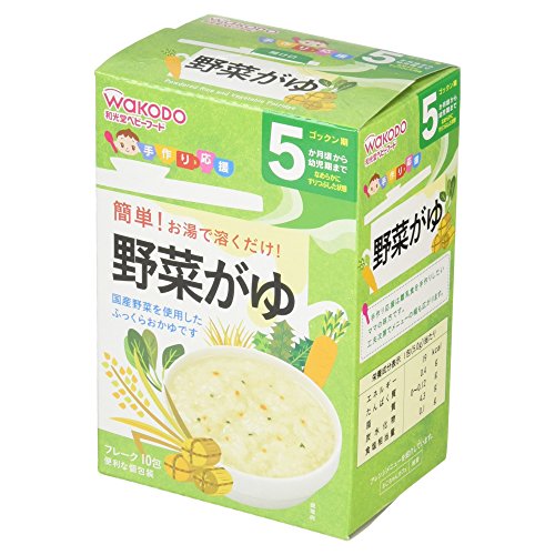 ●【商品説明】●「手作り応援 野菜がゆ 10包 5ヶ月頃から」は、国産野菜を使用したふっくらおかゆ(ベビーフード)です。●お湯を加えるだけで、ふっくらおかゆができあがります。●便利な個包装タイプ。●5ヶ月頃から幼児期まで。●なめらかにすりつぶした状態。●【原材料に含まれるアレルギー物質】●小麦●【ご注意】●※着色料、保存料、香料は使用しておりません。●※デキストリンとは、でんぷんを消化吸収しやすいように分解したものです。●お湯の取り扱いにご注意ください。●袋開封後は吸湿しやすいので袋の口を輪ゴムなどでしめて、なるべく早めにお使いください。●食べ残しや作りおきはあげないでください。●月齢は目安です。●あせらずに段階的にすすめましょう。●離乳のすすめ方については、専門家にご相談ください。●まれに黒褐色の小片が見られることがありますが、原料の一部ですのでご心配ありません。●【保存方法】●直射日光、高温多湿を避け常温で保存してください。●【お問い合わせ先】●和光堂株式会社 お客様相談室東京都千代田区神田司町2-14-3フリーダイヤル:0120-88-9...