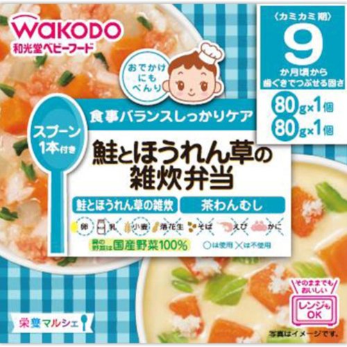 ●【商品説明】●「和光堂 ベビーフード 栄養マルシェ 9か月頃から 鮭とほうれん草の雑炊弁当」は、おでかけに便利なスプーン付きの容器入りレトルトベビーフードです。●忙しいママの代わりに、バランスのとれた食事をしっかりケアします。●食事バランスを考えた主食とおかずのセットメニュー(2個入)。●食器としてそのまま使える、電子レンジ対応可能なカップ容器入り。●「鮭とほうれん草の雑炊」と「茶わんむし」の詰め合わせです。●賞味期限等の表記について西暦年/月/日の順番でパッケージに記載。●【原材料に含まれるアレルギー物質】●卵、小麦●【お召し上がり方】●ご使用方法調理済みですので、温めずにそのまま召し上がれます。●電子レンジで温める場合(1)容器のふたシールを完全に取り除いてください。●(2)500-600Wで加熱してください。●(600Wを超えての使用はしないでください。●)●加熱時間の目安500W/600W 1個:20秒、500W/600W 2個:20秒※電子レンジ600W超調理不可※電子レンジオート設定不可●加熱のしすぎによる中身の飛びはねや、やけどを避けるた...