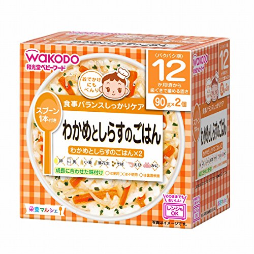 ●【商品説明】●「和光堂 ベビーフード 栄養マルシェ 12か月頃から わかめとしらすのごはん」は、おでかけに便利なスプーン付きの容器入りレトルトベビーフードです。●忙しいママの代わりに、バランスのとれた食事をしっかりケアします。●主食メニューの2個入です。●食器としてそのまま使える、電子レンジ対応可能なカップ容器入り。●海の香りをぎゅっとつめ込んだわかめとしらすのごはんです。●賞味期限等の表記について西暦年/月/日の順番でパッケージに記載。●【原材料に含まれるアレルギー物質】●本品中のしらすおよびわかめは、えび、かにが混ざる方法で採取しています。●【お召し上がり方】●ご使用方法調理済みですので、温めずにそのまま召し上がれます。●電子レンジで温める場合(1)容器のふたシールを完全に取り除いてください。●(2)500-600Wで加熱してください。●(600Wを超えての使用はしないでください。●)●加熱時間の目安500W/600W 1個:20秒、500W/600W 2個:20秒※電子レンジ600W超調理不可※電子レンジオート設定不可●加熱のしすぎによる中身の飛...