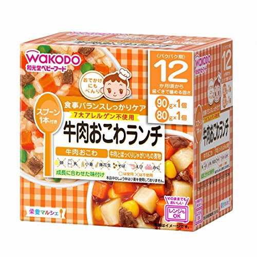 ●【商品説明】●「和光堂 ベビーフード 栄養マルシェ 12か月頃から 牛肉おこわランチ」は、おでかけに便利なスプーン付きの容器入りレトルトベビーフード(12ヶ月頃から)です。●忙しいママの代わりに、バランスのとれた食事をしっかりケアします。●食事バランスを考えた主食とおかずのセットメニュー(2個入)。●食器としてそのまま使える、電子レンジ対応可能なカップ容器入り。●「牛肉おこわ」と「牛肉とほっくりじゃがいもの煮物」の詰め合わせです。●7大アレルゲン不使用です。●賞味期限等の表記について西暦年/月/日の順番でパッケージに記載。●【原材料に含まれるアレルギー物質】●本品中のしょうゆは小麦を使用しておりません。●【お召し上がり方】●ご使用方法調理済みですので、温めずにそのまま召し上がれます。●電子レンジで温める場合(1)容器のふたシールを完全に取り除いてください。●(2)500-600Wで加熱してください。●(600Wを超えての使用はしないでください。●)●加熱時間の目安500W/600W 1個:20秒、500W/600W 2個:20秒※電子レンジ600W超調...