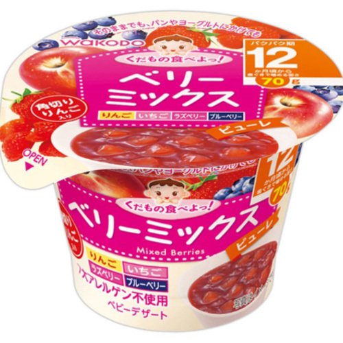 ●商品説明:甘酸っぱいイチゴ、ブルーベリー、ラズベリーを、りんごやぶどうと一緒に食べやすく仕上げたピューレ(ベビーフード)です。そのままでもおいしく、パンやヨーグルトにかけたり、お好みのアレンジでおやつや食事のバリエーションを増やせます。年齢に合った大きさの角切りりんご入り。対象月齢:12ヶ月頃から。