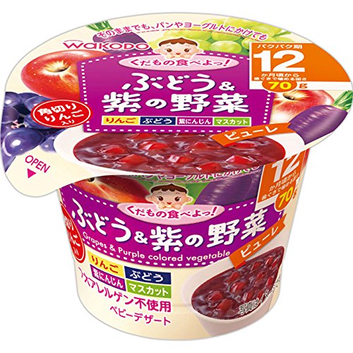 ●商品説明:くだものと紫色の野菜を混ぜ合わせたピューレ(ベビーフード)です。ぶどうの香りがいっぱいに広がる、まろやかな味わいです。そのままでもおいしく、パンやヨーグルトにかけたり、お好みのアレンジでおやつや食事のバリエーションを増やせます。年齢に合った大きさの角切りりんご入り。対象月齢:12ヶ月頃から。