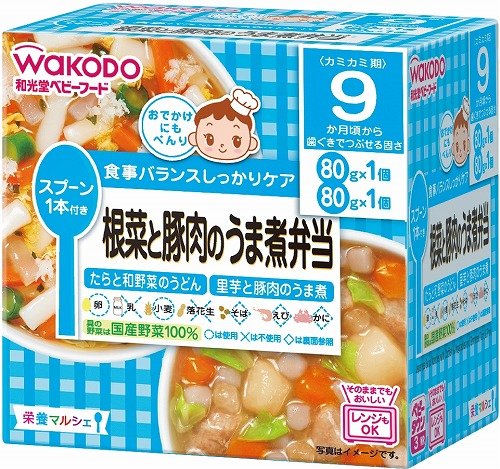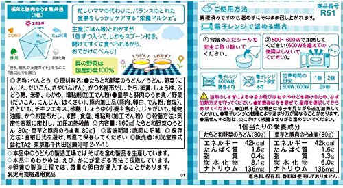 - 原材料:●たらと和野菜のうどん/うどん、野菜(にんじん、だいこん、さやいんげん)、かつお昆布だし、たら、卵黄、しょうゆ、ぶどう糖、米酢、わかめ、増粘剤(加工でん粉) ●里芋と豚肉のうま煮/野菜(だいこん、にんじん、はくさい)、豚肉加工品(豚肉、卵白、でん粉、食塩)、さといも、チキンエキス、砂糖、しょうゆ(小麦を含む)、じゃがいも、植物油脂、かつお昆布だし、米酢、食塩、増粘剤(加工でん粉)