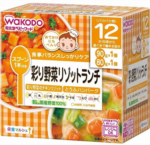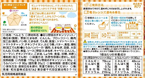 - 原材料:●彩り野菜のチキンリゾット/精白米(国産)、野菜(たまねぎ、にんじん、ブロッコリー)、鶏肉加工品(鶏肉、パン粉、たまねぎ、でん粉、食塩)、トマトペースト、トマトケチャップ、チキンブイヨン、ぶどう糖、バター、食塩、増粘剤(加工でん粉) ●とうふハンバーグ/鶏肉、たまねぎ、豆腐、大豆たん白、でん粉、食塩、ソース[野菜(たまねぎ、キャベツ、にんじん、ピーマン)、チキンブイヨン、ごま油、しょうゆ、食塩、砂糖、米酢]、増粘剤(加工でん粉)