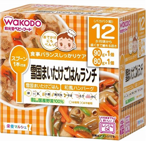 - 原材料:●雪国まいたけごはん/精白米(国産)、野菜(にんじん、ごぼう)、肉加工品(豚肉、鶏レバー、鶏肉、卵白、でん粉、食塩)、チキン・フィッシュブイヨン、まいたけ、しょうゆ(小麦を含む)、砂糖、チキンブイヨン、植物油脂、ほたてエキス、米酢、食塩、増粘剤(加工でん粉) ●和風ハンバーグ/食肉(牛肉、鶏肉)、たまねぎ、つなぎ(パン粉、卵白)、大豆たん白、食塩、ソース[野菜(たまねぎ、にんじん、ごぼう、ピーマン)、砂糖、しょうゆ、しいたけ、米酢、食塩]、増粘剤(加工でん粉)