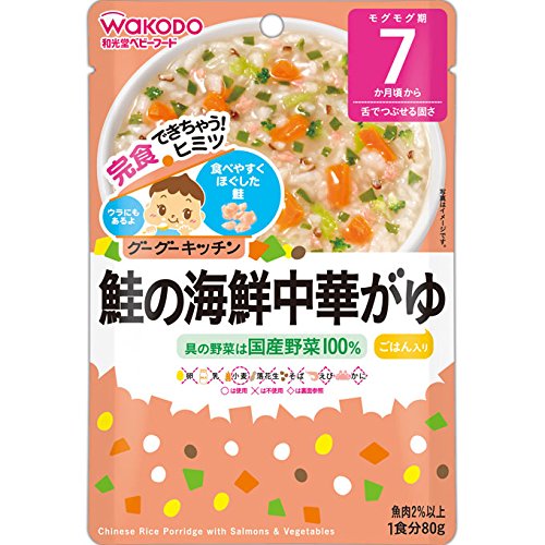 ●【商品説明】●「和光堂 グーグーキッチン 鮭の海鮮中華がゆ 7か月頃から 80g」は、月齢にあわせた具材の固さと大きさ、食べやすい食感にこだわったベビーフードです。●着色料、保存料、香料は使用しておりません。●鮭とわかめ、たっぷりの野菜とお米を、おだしでコトコト炊き上げました。●魚肉2%以上。●賞味期限等の表記について西暦年/月/日の順番でパッケージに記載。●【お問い合わせ先】●アサヒグループ食品株式会社東京都墨田区吾妻橋1-23-1お問い合せ先お客様相談室東京都渋谷区恵比寿南2-4-1フリーダイヤル:0120-889283●【原産国】●日本●【原材料名・栄養成分等】●名称:米飯類●原材料名:野菜(にんじん、キャベツ、ブロッコリー)、精白米(国産)、さけ、かつお昆布だし、ぶどう糖、ごま油、しいたけ水煮、米酢、しょうゆ(小麦・大豆を含む)、たいエキス、食塩、乾燥わかめ、ちりめんエキス/増粘剤(加工でん粉)●栄養成分表示:1袋80g当たり/エネルギー:41kcal、たんぱく質:1.0g、脂質:0.6g、炭水化物:7.8g、食塩相当量:0.2g●【保存方法】●...