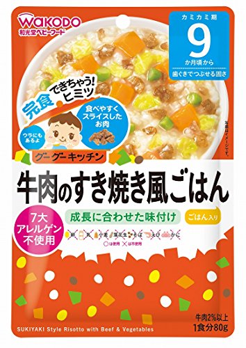 ●【商品説明】●「和光堂 グーグーキッチン 牛肉のすき焼き風ごはん 9か月頃から 80g」は、月齢にあわせた具材の固さと大きさ、食べやすい食感にこだわったベビーフード(9ヶ月頃から)です。●着色料、保存料、香料は使用しておりません。●牛肉とたっぷりの野菜をお米と一緒に和風だしで煮込んだすき焼き風ご飯です。●小麦を使用していないしょうゆを使っています。●賞味期限等の表記について西暦年/月/日の順番でパッケージに記載。●【お問い合わせ先】●アサヒグループ食品株式会社東京都墨田区吾妻橋1-23-1お問い合せ先お客様相談室東京都渋谷区恵比寿南2-4-1フリーダイヤル:0120-889283●【原産国】●日本●【原材料名・栄養成分等】●名称:米飯類●原材料名:精白米(国産)、野菜(にんじん、はくさい、さやいんげん)、かつお昆布だし、たまねぎピューレー、牛肉、まいたけ水煮、しょうゆ(大豆を含む)、米酢、食塩/増粘剤(加工でん粉)●栄養成分表示:1袋(80g)当たりエネルギー:56kcal、たんぱく質:1.6g、脂質:0.3g、炭水化物:11.8g、食塩相当量:0.3g●...