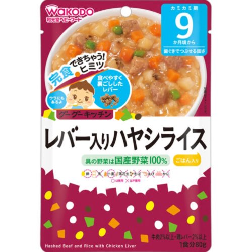 ●【商品説明】●「和光堂 グーグーキッチン レバー入りハヤシライス 9か月頃から 80g」は、月齢にあわせた具材の固さと大きさ、食べやすい食感にこだわったベビーフードです。●着色料、保存料、香料は使用しておりません。●野菜たっぷりのハヤシソースに裏ごしレバーを加え、食べやすく仕上げました。●牛肉2%以上、鶏レバー2%以上。●賞味期限等の表記について西暦年/月/日の順番でパッケージに記載。●【お問い合わせ先】●アサヒグループ食品株式会社東京都墨田区吾妻橋1-23-1お問い合せ先お客様相談室東京都渋谷区恵比寿南2-4-1フリーダイヤル:0120-889283●【原産国】●日本●【原材料名・栄養成分等】●名称:米飯類●原材料名:精白米(国産)、野菜(にんじん、さやいんげん)、牛肉加工品(牛肉、でん粉、卵白(卵を含む)、食塩)、トマトピューレー、オニオンソテー、じゃがいも、チキンブイヨン、鶏レバー、トマトケチャップ、しょうゆ(小麦・大豆を含む)、砂糖、まいたけ水煮、りんごピューレー、食塩/増粘剤(加工でん粉)●栄養成分表示:1袋80g当り/エネルギー:61kcal、た...