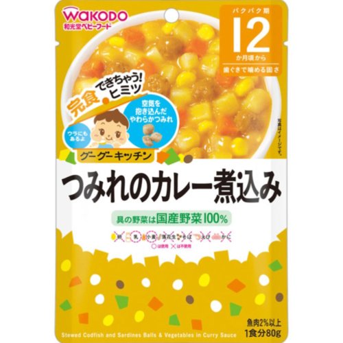 ●【商品説明】●「和光堂 グーグーキッチン つみれのカレー煮込み 12か月頃から 80g」は、月齢にあわせた具材の固さと大きさ、食べやすい食感にこだわったベビーフード(12ヶ月頃から)です。●着色料、保存料、香料は使用しておりません。●つみれを野菜入りのカレーソースで煮込みました。●臭みがないので食べやすいです。●賞味期限等の表記について西暦年/月/日の順番でパッケージに記載。●【お問い合わせ先】●アサヒグループ食品株式会社東京都墨田区吾妻橋1-23-1お問い合せ先お客様相談室東京都渋谷区恵比寿南2-4-1フリーダイヤル:0120-889283●【原産国】●日本●【原材料名・栄養成分等】●名称:野菜・魚介煮物●原材料名:野菜(にんじん、スイートコーン)、じゃがいも、牛乳、魚ボール(いわし、たらすり身(たら、砂糖)、パン粉(小麦を含む)、植物油脂、たまねぎ、食塩)、野菜ピューレー(かぼちゃ、たまねぎ)、トマトピューレー、りんごピューレー、トマトケチャップ、ほたてエキス、砂糖、カレー粉、チキンエキス、食塩/増粘剤(加工でん粉)●栄養成分表示:1袋(80g)当たりエ...