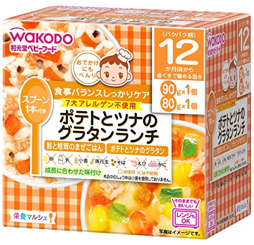 - 原材料:●鮭と椎茸のまぜごはん/精白米(国産)、にんじん、かつお昆布だし、さけ、しいたけ、砂糖、しょうゆ(大豆を含む)、食塩、米酢/増粘剤(加工でん粉) ●ポテトとツナのグラタン/野菜(にんじん、たまねぎ、キャベツ、スイートコーン、かぼちゃ)、豆乳(大豆を含む)、じゃがいも、まぐろフレーク(まぐろ、食塩)、砂糖、チキンエキス、チキン・フィッシュブイヨン、チキンオイル、食塩、米酢/増粘剤(加工でん粉)