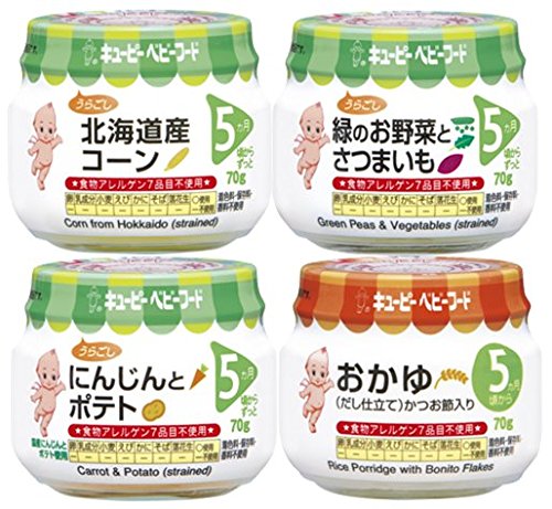 - 【セット内容】キューピー 北海道産コーン(うらごし) 70g 緑のお野菜とさつまいも(うらごし) 70g にんじんとポテト(うらごし) 70g おかゆ(だし仕立て) 70g