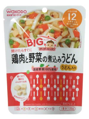 「BIGサイズのグーグーキッチン 鶏肉と野菜の煮込みうどん 120g」は、ボリュームたっぷりビッグサイズのベビーフードです。食べやすい長さに切った讃岐うどんと歯ぐきで噛めるふんわり鶏肉、たっぷりの野菜をかつお昆布だしでコトコト煮込みました。咀嚼を考えた食べやすく、噛みやすい具材。国産野菜を使用しています。ごはんの量もステップアップ、パクパク期の12か月頃から。着色料、保存料、香料は使用していません。 内容量 : 120g(1食分)