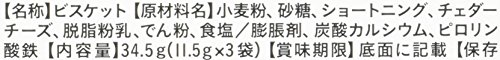 - 原材料:小麦粉、砂糖、ショートニング、チェダーチーズ、脱脂粉乳、でん粉、食塩/膨脹剤、炭酸カルシウム、ピロリン酸鉄