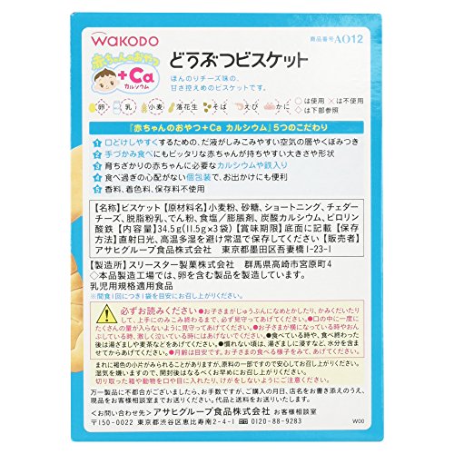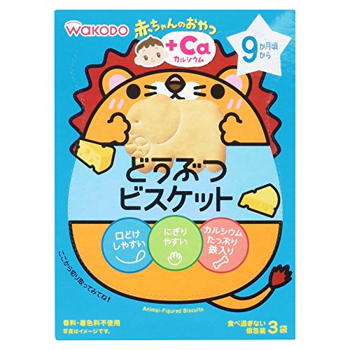 ●【商品説明】●「和光堂 赤ちゃんのおやつ +Caカルシウム どうぶつビスケット 9か月頃から 11.5g×3袋」は、お子さまの月齢に合った口どけ・固さ・味付けに配慮し、にぎりやすい、つまみやすい形状にしたママも安心してあげられる鉄やカルシウム入りのおやつシリーズです。●ほんのりチーズ味の、甘さ控えめのビスケットです。●賞味期限等の表記について西暦年/月/日の順番でパッケージに記載。●【お問い合わせ先】●販売元アサヒグループ食品株式会社 お客様相談室東京都渋谷区恵比寿南2-4-1フリーダイヤル:0120-88-9283●【原産国】●日本●【原材料名・栄養成分等】●品名・名称:ビスケット●原材料名:小麦粉、砂糖、ショートニング、チェダーチーズ、脱脂粉乳、でん粉、食塩/膨脹剤、炭酸カルシウム、ピロリン酸鉄●栄養成分/1袋11.5g当たり:エネルギー52kcal、たんぱく質1.3g、脂質1.5g、炭水化物8.4g、食塩相当量0.06g、カルシウム28mg、鉄0.16mg●【保存方法】●直射日光を避け、高温多湿を避け常温で保存してください。●【ご注意】●お子さまが...