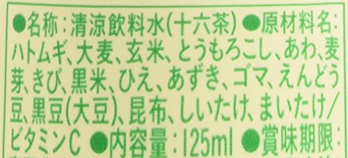 - 原材料:ハトムギ、大麦、玄米、とうもろこし、あわ、麦芽、きび、黒米、ひえ、あずき、ゴマ、えんどう豆、黒豆(大豆)、昆布、しいたけ、まいたけ/ビタミンC