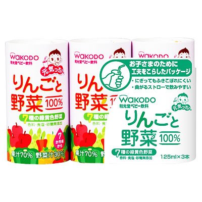 「元気っちりんごと野菜125ml*3本」は、青森県産のりんごと7種類の野菜をおいしくブレンドしたジュース(ベビー用)です。にぎってもふきこぼれにくい、曲がるストローで飲みやすい、お子さまのために工夫をこらしたパッケージ。タブシールを開ければ、マグやコップに移して飲めます。
