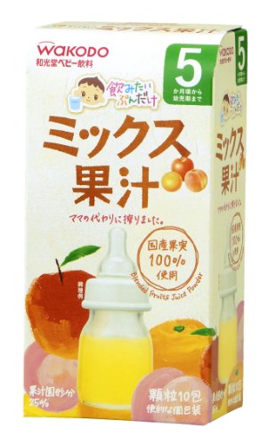 「飲みたいぶんだけ ミックス 果汁5g*10包」は、国産りんご、みかん、パインアップル、ももを赤ちゃんに飲みやすくミックスしたジュース(ベビー用)です。果汁固形分25%。そのままお飲みいただくことはもちろん、おいもに混ぜたり野菜を加えたりと、いろいろなメニュー作りにお役立てください。5か月頃からお使いいただけます。顆粒タイプ。便利な個包装。 内容量 : 50g(5g*10包)