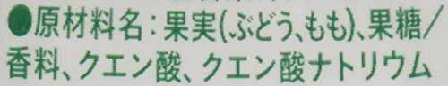 - 原材料:果実(ぶどう、もも)、果糖/香料、クエン酸、クエン酸ナトリウム
