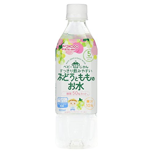 「和光堂 ベビーのじかん ぶどうともものお水 500mL」は、すっきり飲みやすい、糖質50%カット(*)のお水です。やさしい、おいしいブドウとモモの風味♪果汁10%。5ヶ月頃から。(*)和光堂アップルウォーター比べ。
