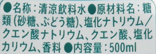- 原材料:糖類(砂糖、ぶどう糖)、塩化ナトリウム/クエン酸ナトリウム、クエン酸、塩化カリウム、香料