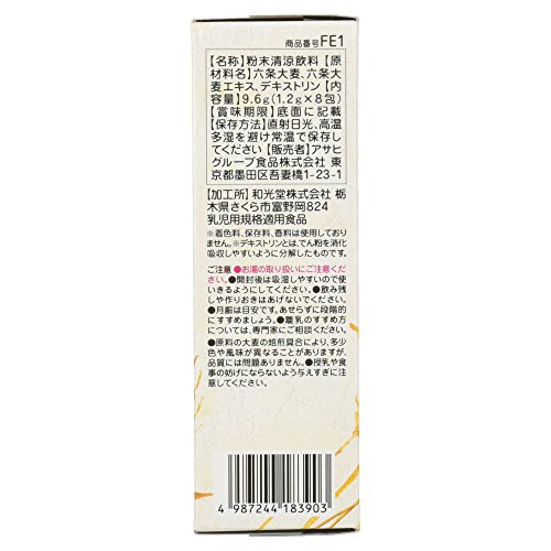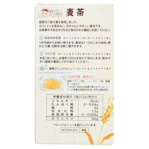 ●【商品説明】●「和光堂 飲みたいぶんだけ 麦茶 1か月頃から 1.2g×8包」は、国産の六条大麦を使用、カフェインを含まない、赤ちゃんにやさしい麦茶です。●お食事中やお出かけ先など毎日の水分補給にお使いください。●賞味期限等の表記について西暦年/月/日の順番でパッケージに記載。●【お問い合わせ先】●販売元アサヒグループ食品株式会社 お客様相談室東京都渋谷区恵比寿南2-4-1フリーダイヤル:0120-88-9283●【原産国】●日本●【原材料名・栄養成分等】●品名・名称:粉末清涼飲料●原材料名:六条大麦、六条大麦エキス、デキストリン●栄養成分/1袋1.2g当たり:エネルギー5kcal、たんぱく質0-0.04g、脂質0g、炭水化物1.2g、食塩相当量0-0.002g、カフェイン0mg●【保存方法】●直射日光を避け、高温多湿を避け常温で保存してください。●【ご注意】●お湯の取扱いにご注意ください。●開封後は吸湿しやすいので使い切るようにしてください●飲み残し作りおきはあげないでください●月齢は目安です。●あせらずに段階的にすすめましょう●離乳のすすめ...