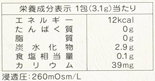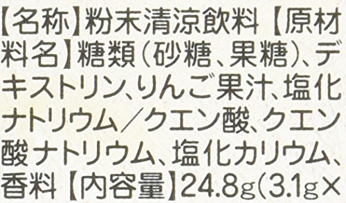 - 原材料:糖類(砂糖、果糖)、デキストリン、りんご果汁、塩化ナトリウム/クエン酸、クエン酸ナトリウム、塩化カリウム、香料