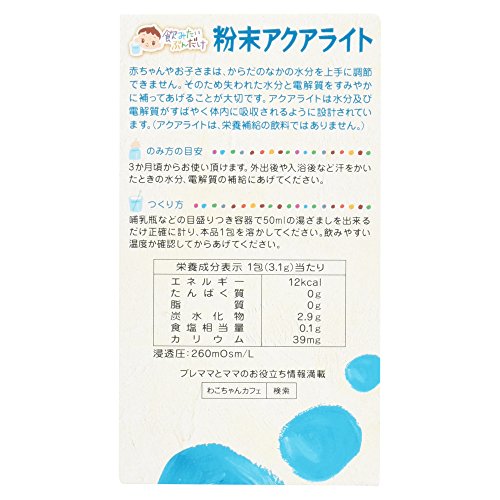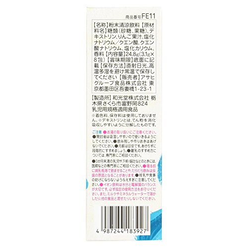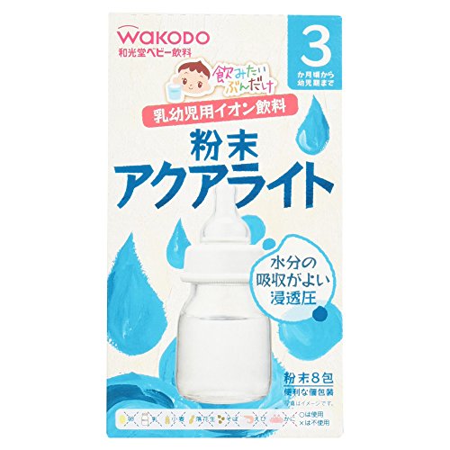 ●【商品説明】●「和光堂 飲みたいぶんだけ 粉末アクアライト 3か月頃から 3.1g×8包」は、水分及び電解質がすばやく体内に吸収されるように設計されています。●赤ちゃんやお子さまは、からだのなかの水分を上手に調節できません。●そのため失われた水分と電解質をすみやかに補ってあげることが大切です。●賞味期限等の表記について西暦年/月/日の順番でパッケージに記載。●【お問い合わせ先】●販売元アサヒグループ食品株式会社 お客様相談室東京都渋谷区恵比寿南2-4-1フリーダイヤル:0120-88-9283●【原産国】●日本●【原材料名・栄養成分等】●品名・名称:粉末清涼飲料●原材料名:糖類(砂糖、果糖)、デキストリン、りんご果汁、塩化ナトリウム/クエン酸、クエン酸ナトリウム、塩化カリウム、香料●栄養成分/1袋3.1g当たり:エネルギー12kcal、たんぱく質0g、脂質0g、炭水化物2.9g、食塩相当量0.1g、カリウム39mg●【保存方法】●直射日光を避け、高温多湿を避け常温で保存してください。●【ご注意】●お湯の取扱いにご注意ください。●開封後は吸湿しやすいの...