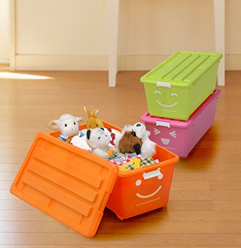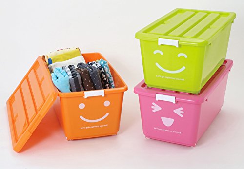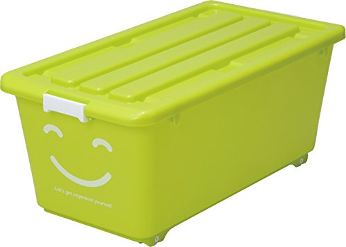 カラフルなフタ付き収納ケース。キャスター付き。積み重ねOK。