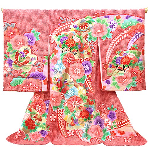 【お宮参り着物】【赤地系 扇面に花柄】女の子 染め絞り 友禅 刺繍 正絹【風呂敷プレゼント / ギフト対応】