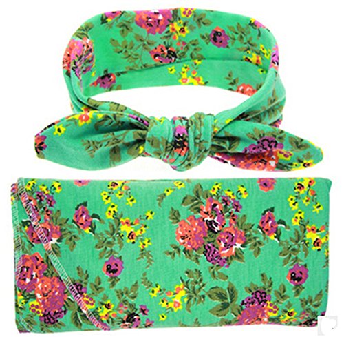 おくるみ ひざ掛け ブランケット+ヘッドバンド 赤ちゃんウサギの耳 花 包まれたタオル ベビースリーパー 出産祝い (緑)