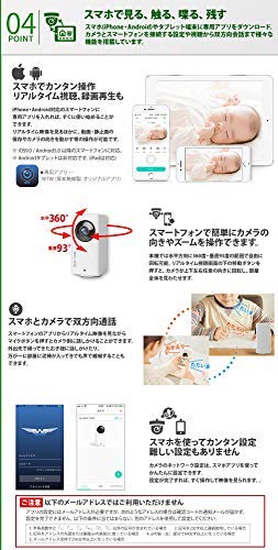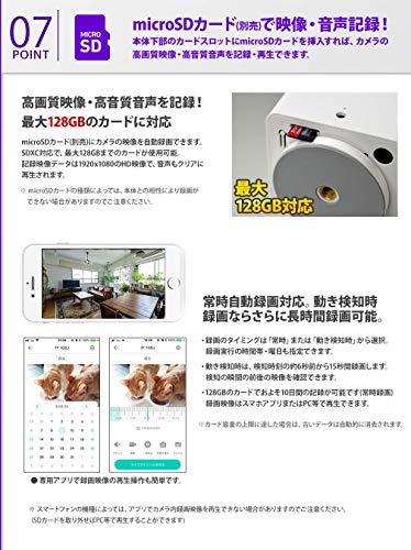 BESTCAM108J 防犯カメラ 画面内の動きを検知して動くものを画面内に捉え続ける「自動追跡機能」の性能が大幅に向上! 20m程度離れた人物の動きも検知・追跡します。 Wi-Fiに接続・スマートフォンで操作可能な最新型ホームネットワークカメラ・防犯カメラ です。 BESTCAM108J 防犯カメラ 左右360度・上下93度の範囲でカメラの向きを回転可能です。カメラ映像内の「動き」部分を自動検知し、カメラの向きを動かして対象を撮影し続ける「自動追跡」機能を搭載。また、自動で90度ずつ向きを変え、360度全方向を順に撮影する「自動巡回機能」も利用できる防犯カメラ です。 BESTCAM108J 防犯カメラ 室内や外出先から、スマートフォンのアプリでカメラ映像を見ることができます。また、カメラの回転・映像音声の再生・設定の変更等の操作が可能。カメラに内蔵のマイク・スピーカーを使って音声双方向通話も可能な 防犯カメラ です。 BESTCAM108J 塚本無線 WTW-IPW108J 最大128GBのmicroSDカード(別売)にFull HD(1920x1080)画質で音声つきカメラ映像を録画できます。常時録画のほか、動き検知時のみ録画することも可能です。microSDカードに録画した過去の映像は、スマートフォンやPCで再生できます。 カメラ映像内の動き検知時にスマートフォンに通知する「動き検知アラーム」も利用できます。アラームON/OFFのスケジュールも設定可能な 防犯カメラ です。