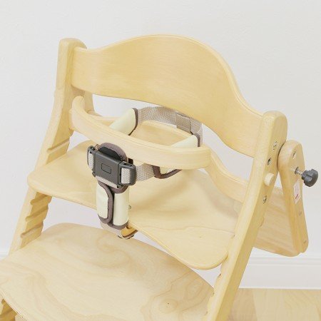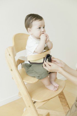 - ベビーチェアにお座りするお子さまの立上り防止のために開発されたチェアベルト。
