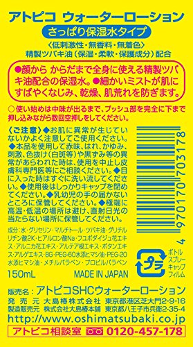 「アトピコスキンケア ウォーターローション 150ml」は、精製椿油を配合した、さっぱりタイプの全身用スキンケア化粧水です。顔にも身体もお使い頂けます。ミクロの霧がお肌をやさしく包み、みずみずしくうるおいます。また、精製椿油がお肌の乾燥を防ぎ、しっとりと保ちます。お肌が乾燥しがちなお子様や、刺激に弱い肌の方、乳幼児のスキンケアにおすすめです。低刺激性・無香料・無着色。 含有成分 水、グリセリン、マルチトール、ツバキ油、グリチルリチン酸2K、ヒアルロン酸Na、シナノキエキス、アルニカエキス、アルテアエキス、ボタンエキス、褐藻エキス、緑藻エキス、紅藻エキス、Bg、PEg-60水添ヒマシ油、PEg-20水添ヒマシ油、メチルパラベン、ブチルパラベン