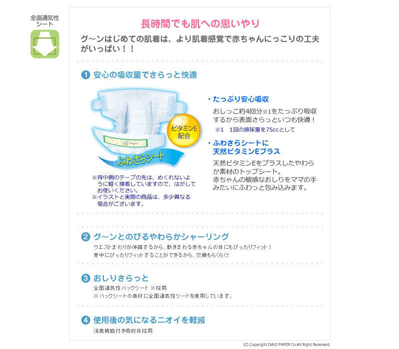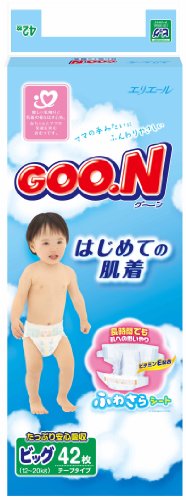 「グーンはじめての肌着テープBIGサイズ42枚」は、ママの手みたいにふんわり、敏感肌にもやさしい紙おむつです。