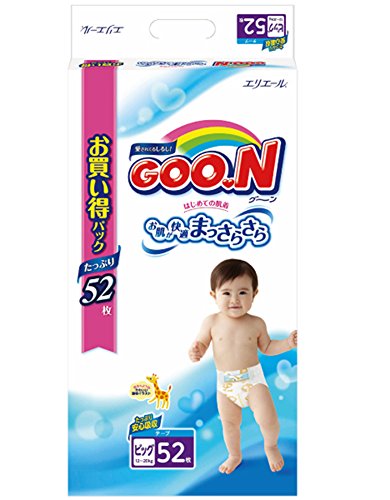 ●【商品説明】●「グーン はじめての肌着 テープ BIGサイズ 52枚入」は、「ふわさらシート」により、赤ちゃんの繊細な肌をやさしくつつむ紙おむつです。●おしっこ4回分*をたっぷり吸収する安心の吸収量でさらっと快適に過ごせます。●ビタミンE配合。●*1回の排尿量を75ccとして。●バックシートの素材に全面通気性シートを使用。●消臭機のつきの吸収体を採用。●使用後の気になるニオイを軽減します。●おしっこお知らせマークつき。●絵本のようなかわいい動物イラスト入り。●全部で14種類。●※商品リニューアルに伴い、パッケージのデザインが新旧混在する可能性がございます。●ご了承ください。●※数量限定デザインのお届けとなる場合がございます。●柄は選べませんのでご了承ください。●【使用方法】●■紙おむつの上手なつけ方(1)立体ギャザーが、立っていることを確認してください(指で簡単に立ちます)。●(2)あしをM字型に広げ、ギャザーを伸ばしたまま、あててください。●おなかまわりは、指が1本入る位にしてください。●(3)テープの接着強度を上げるため、テープを上から押さえ...