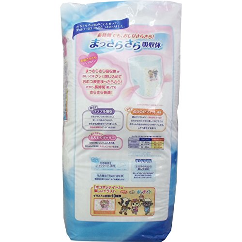個装サイズ:205X430X170mm 個装重量:1800g 内容量:36枚入 【適用】体重13~25kgまで おなかまわりの目安・・・48cm~63cm 【素材】表面材・・・ポリオレフィン系不織布 吸水材・・・綿状パルプ、高分子吸水材、吸水紙、ポリオレフィン系不織布 防水材・・・ポリオレフィン系フィルム 止着材・・・ポリオレフィン系フィルム 伸縮材・・・ポリウレタン 結合材・・・スチレン系合成樹脂等