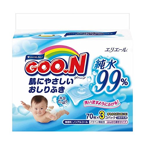 「グーン 肌にやさしいおしりふき つめかえ用 70枚×3個 (210枚入)」は、水分たっぷりで肌に優しく軽い力で汚れを落とすおしりふきです。精製水99%。パラベン無配合で、より肌にやさしい薬液成分に。ふわふわ波形シートの凸凹で、こびりついたうんちもしっかり拭きます。詰め替え用。