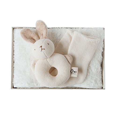 裏がパイル地になったソックス、うさぎのがらがらのかわいらしいセットです。
