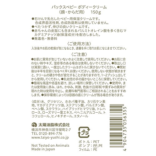 「パックスベビー ボディークリーム 150g」は、石けんで乳化したベビー用保湿ボディクリームです。合成界面活性剤、合成防腐剤は使用していません。赤ちゃんの皮脂にも含まれるパルミトオレイン酸を多く含むマカデミアナッツ油(保湿成分)を配合しました。家での使用に便利なポンプ入り。無着色・無香料。 使用方法 入浴後やお肌の乾燥が気になるとき、適量を手に取りお肌になじませてください。 ご注意 ●お肌に異常が生じていないかよく注意してご使用してください。